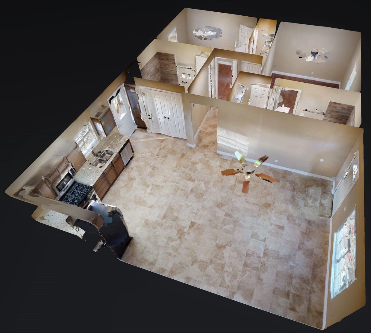 Step inside to a stylish living space with tile flooring in the living room, kitchen, bathrooms, and laundry area, complemented by dark bronze light fixtures, fans, and hardware throughout. The kitchen boasts dark espresso cabinets, granite countertops, and stainless-steel appliances, including a fridge, stove, dishwasher, and microwave.